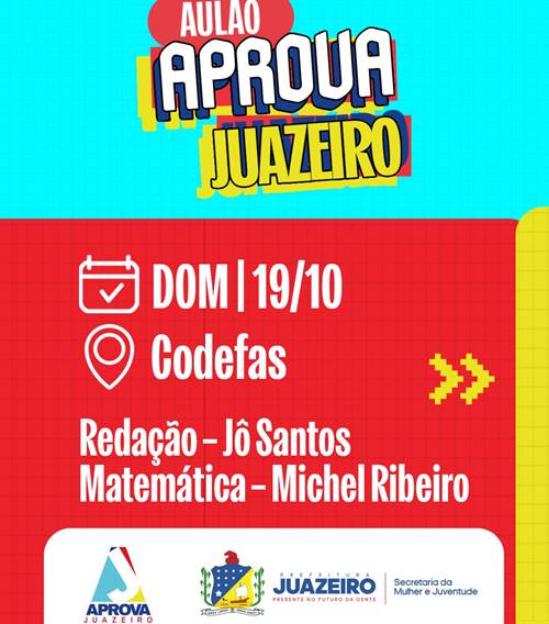 A Secretaria da Mulher e Juventude (SMJ) da prefeitura de Juazeiro anunciou a abertura das inscrições para o primeiro ciclo de aulões do programa 'Aprova Juazeiro'. Este evento acontecerá no próximo domingo, dia 19, das 8h às 12h, no Colégio Democrático Estadual Professora Florentina Alves dos Santos (CODEFAS), situado na Rua Lafaiete Coutinho, nº 454, no Bairro Piranga.