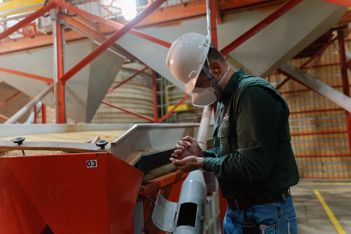 Assim que as cargas chegam à Agro-Sol, inicia-se a etapa de pré-limpeza, que remove impurezas e grãos fora do padrão. As sementes são então transferidas para silos equipados com sistemas de aeração, onde permanecem até a secagem controlada, que reduz a umidade a níveis ideais, entre 12% e 12,5%.